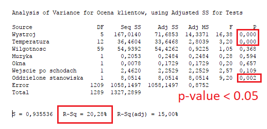 Test ANOVA mówi, że te zmienne, których p-value jest mniejsze od przyjętego współczynnika ufności α = 0,05 jest istotne dla klientów banku.  Okazało się, że "wilgotność", „muzyka”, "okna" oraz „wejście po schodach” nie mają większego znaczenia dla respondentów.