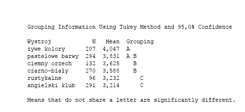 Test Turkey wskazał, że „żywe kolory” i „pastelowe barwy” są najwyżej oceniane przez klientów (średnie oceny 4,0 oraz 3,8). Obie wartości znajdują się w jednej grupie przez co można uznać, że ich średnie w odniesieniu przez odchylenia standardowe przy współczynniku ufności α = 0.05 nie różnią się od siebie.