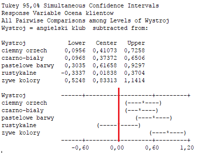 Różnice można zaobserwować w graficznej prezentacji odchylenia standardowego. Poniżej przedstawione jest porównanie wystroju „angielski klub” z pozostałymi wystrojami. Wszystkie wystroje, których przedziały odchylenia standardowego przechodzą przez wartość zero,  znajdują się w jednej grupie z porównywanym wystrojem „angielski klub”. Innymi słowy mówiąc jeżeli przedziały zawierają zero, wtedy istnieje prawdopodobieństwo, że różnica między średnimi wynosi zero.