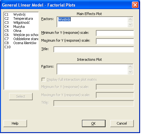 W formularzu Minitab wybraliśmy Pairwise comparisons ponieważ wśród wariantów wystroju nie ma wariantu testowego, granicznego. Innymi słowy mówiąc wszystkie warianty wystroju są prawdziwe. Dodatkowo wybraliśmy prezentację graficzną przedziałów ufności aby lepiej zilustrować test Turkey.
