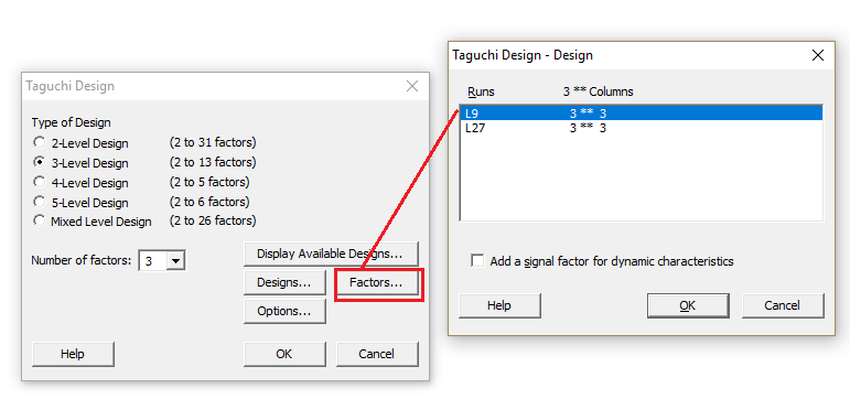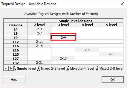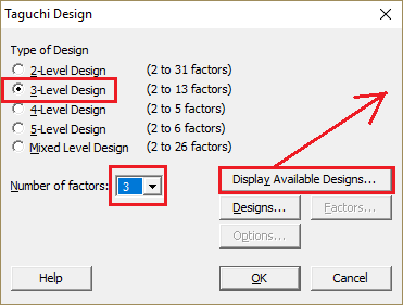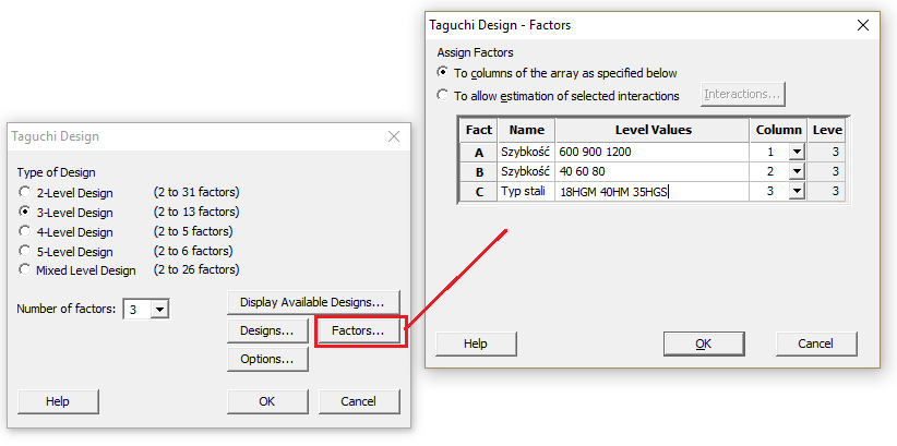 Projektowanie eksperymentu tą metodą nie wymaga ściągania danych do arkusza kalkulacyjnego Minitab. Wybieramy trzy poziomy kombinacji ponieważ mamy trzy zmienne po trzy ustawienia.