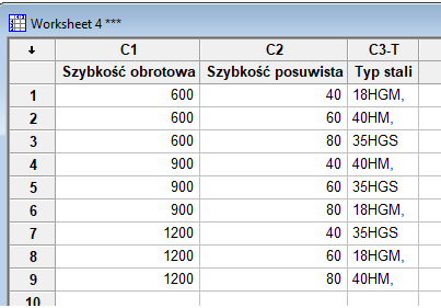Otrzymujemy najprostszą konfiguracje eksperymentu Taguchi wynoszącą 9 kombinacji.