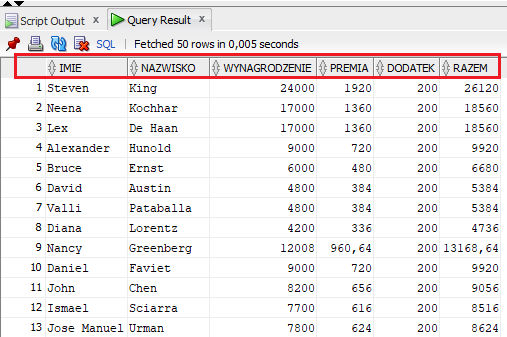 Aby wyświetlić tabelę z pensjami pracowników z tabeli EMPLOYEES należy wpisać następującą instrukcję: