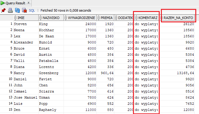 Łączenie nazw kolumn w SQL Oracle jest bardzo użyteczną funkcją. Skorzystamy z tabeli EMPLOYEES z bezpłatnej bazy Oracle HR dostępnej tutaj: http://www.oracle.com/technetwork/database/express-edition/downloads/index.html