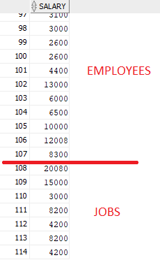 Operator UNION ALL wylistował obie wskazane w tabelach kolumnach, zachowując ich kolejność i powtarzające się wartości. Czerwona linia wskazuje gdzie kończy się tabela EMPLOYEES a zaczyna tabela JOBS.