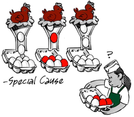 W procesie jazdy samochodem przez miasto może pojawić się coś nieprzewidywalnego, coś co nie jest częścią tego procesu. Zjawiskiem takim może być złapanie gumy lub stłuczka. Takie rzeczy się zdarzają, ale nie są częścią procesu. Takie rzeczy zdarzają się bardzo rzadko. Są to właśnie specjalne przyczyny zmienności.