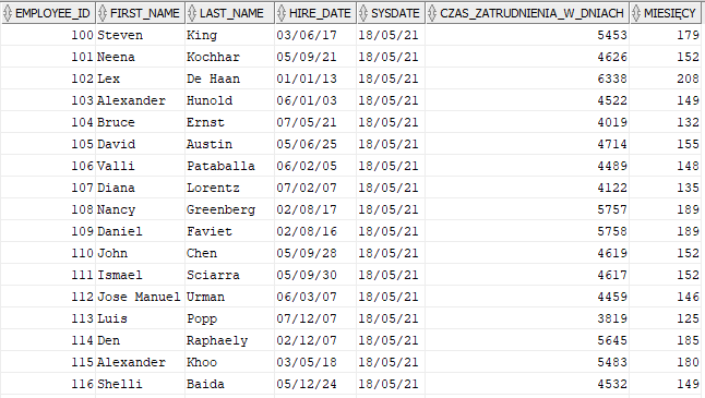 ROUND(SYSDATE - HIRE_DATE) AS CZAS_ZATRUDNIENIA_W_DNIACH,