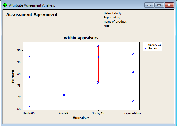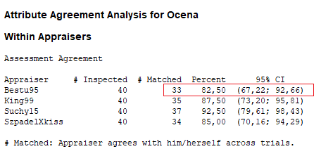 Ponieważ gracze oceniali mapy dwukrotnie, analiza attribute agreement pozwala na ocenę spójności ocen każdego z graczy