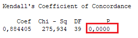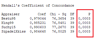 Jeżeli wartość p-value jest mniejsza lub równa przyjętemu współczynnikowi istotności, p =< 0,05, wówczas należy odrzucić hipotezę zerową na rzecz hipotezy alternatywnej, mówiącej, że spójność ocen graczy nie jest przypadkowa.