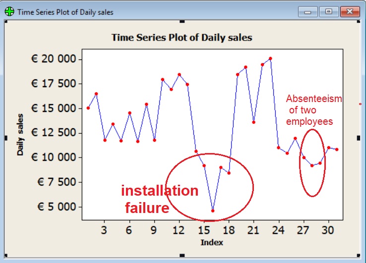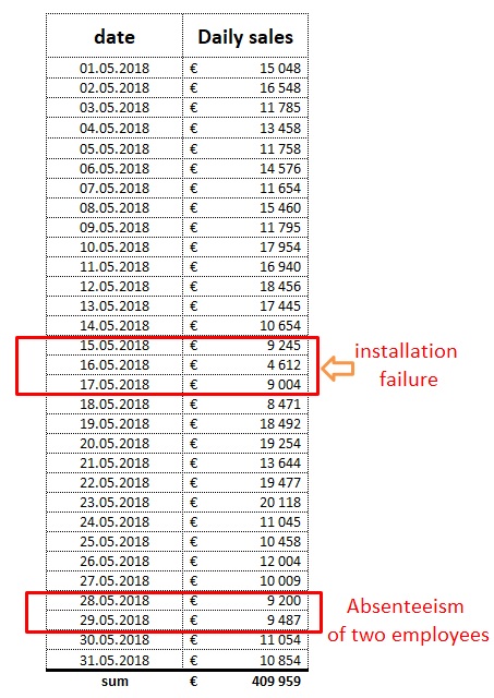 Kierownik wie trochę więcej wie na temat swojej sprzedaży. Ma on dzienne zestawienie sprzedaży i widzi jaki wpływ na sprzedaż miała awaria instalacji oraz nieobecność dwóch kluczowych pracowników pod koniec miesiąca.