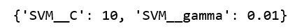 Następnie w kodzie Hyperparameters – wskazaliśmy parametry: 'SVM__C'oraz 'SVM__gamma'.