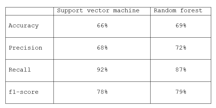 Widzimy, że wyniki estymacji Support Vector Machine versus Random Forest niewiele się różnią.
