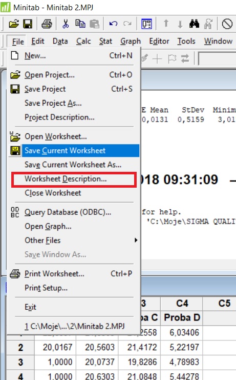 Arkusze w Minitab można również zapamiętywać w formacie Excel i wprowadzać opisy do nich. Taki pliki XLS dają się otwierać w Excelu i mają wartości liczbowe (nie tekstowe).