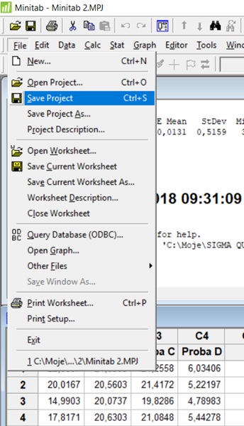Pracę w projekcie Minitab należy zapisać. To pozwoli nam na powrót do projektu w miejscu, gdzie go przerwaliśmy przed zapisaniem.