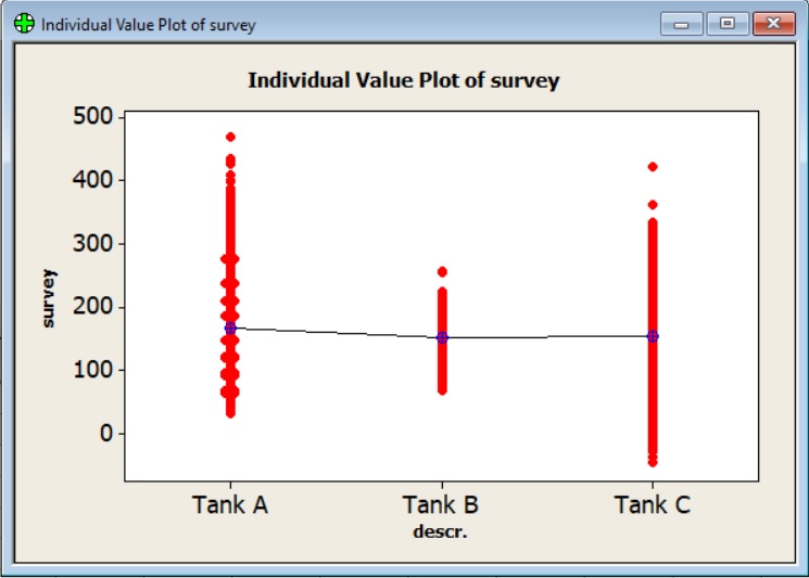 Na osi Y jest skala poziomu. Przez funkcje Data View ustawiliśmy wyświetlanie wartości średniej zaznaczonej niebieskim punktem. Ustawiliśmy również aby wartości średnie dla trzech zbiorników były połączone linią. Średni poziom płynu w trzech zbiornikach jest podobny. Wyraźnie widać, że zbiorniki nie pracują w jednakowy sposób.