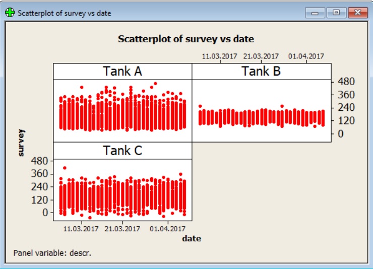 Mamy zadanie graficznego przedstawienia stanu cieczy w 3 zbiornikach technologicznych: A, B i C. Dysponujemy pomiarami przeprowadzonymi w marcu i w początku kwietnia. Łączna liczba pomiarów wynosi 6000, każdy z trzech zbiorników mierzony był w tym okresie 2000 razy. Pomiary były nieregularne, ponieważ odbywały się automatycznie wraz z rozpoczęciem kolejnego cyklu produkcyjnego.