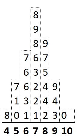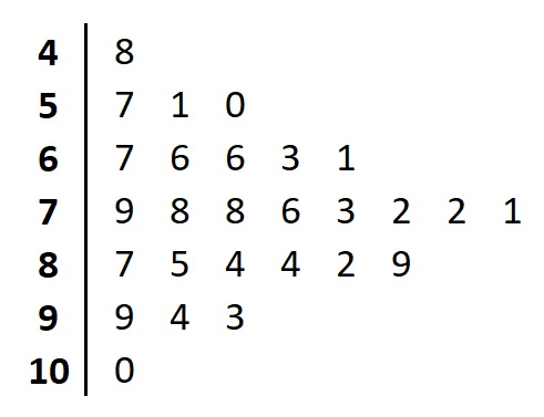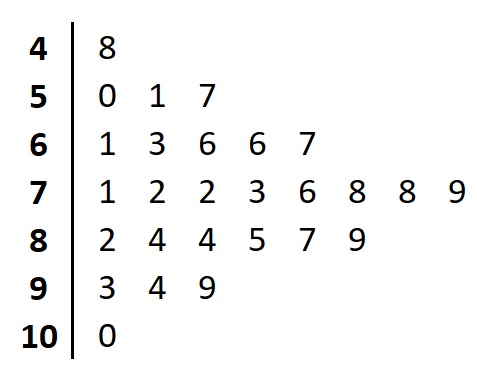 Najniższą wartością w analizowanym zbiorze danych jest wartość 48, skrajna liczba po lewej stronie wykresu. Wartość 4 to łodyga, liczba 8 to liść, co daje liczbę 48.